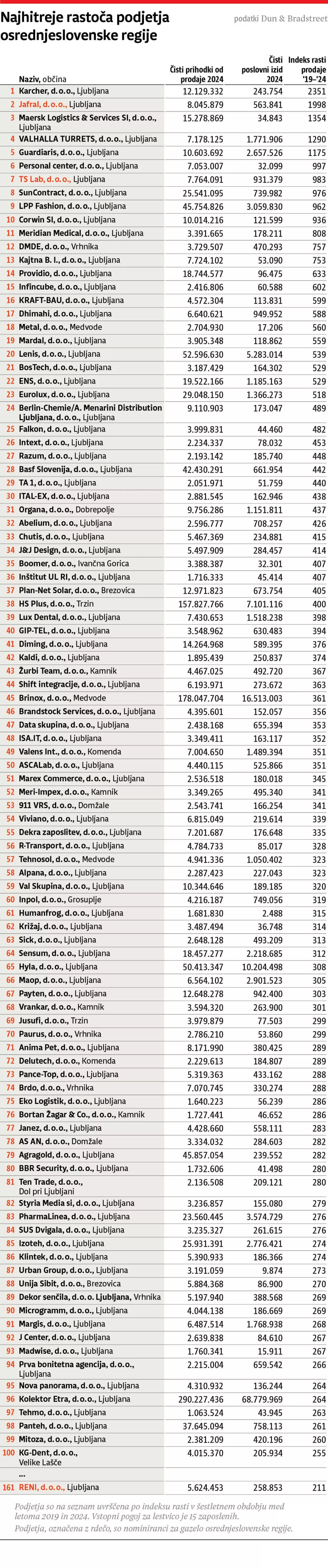 Leta 2024 je v osrednjeslovenski regiji poslovalo 43,3 odstotka vseh gospodarskih družb v državi. Skupno so ustvarile 48,2 odstotka vseh čistih prihodkov od prodaje in prispevale 43,4 odstotka celotne dodane vrednosti v Sloveniji. Čeprav so se skupni prihodki v primerjavi z letom 2023 zmanjšali za približno tri odstotke, predvsem zaradi upada pri največjih štirih družbah, je regija z vidika dodane vrednosti in ustvarjenega dobička ohranila vodilni položaj.