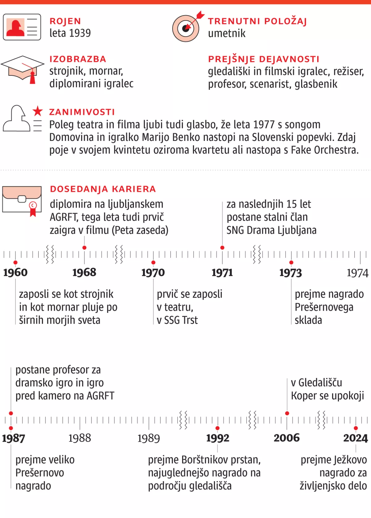 V največji ponos mu je verjetno Borštnikov prstan, najelitnejša nagrada za življenjsko delo na področju gledališča v Sloveniji, ki jo podeljujejo v okviru Borštnikovega srečanja. Tam so mu podelili še štiri nagrade za izbrane kreacije vlog. Pravzaprav pet, saj je bil nagrajen že leta 1970, ko sploh še niso podeljevali nagrad, in sicer za mediteransko obarvano vlogo Agenta Majerja v Štokovi burki Moč uniforme (režija Mario Uršič, SSG Trst). Pot ga je pozneje vodila skoraj po vseh slovenskih gledališčih – v Glej, MGL, SMG, Prešernovo gledališče Kranj, Gledališče Koper, Špas teater.