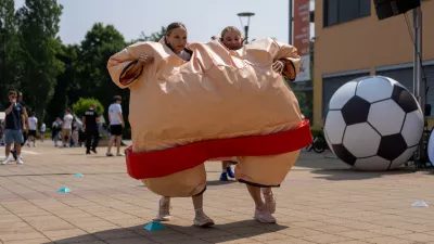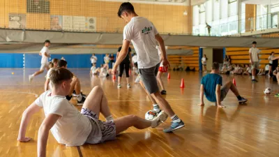 V okviru projekta izumljajo tudi nove športe, kot so: košarka s prevelikimi rokami (v rokavicah in drugih prekrivalih), supergni hokej, nožni namizni tenis, nogomet s plastenko./ Foto: Bold Projects Agency.