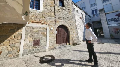 Mladen Neđić, natakar v restavraciji na koprskem Carpacciovem trgu, ki ga je orientalski sršen že dvakrat pičil, kaže na številna gnezda v špranjah na zidu. / Foto: Katja Gleščič