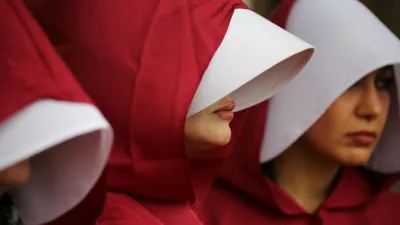 Prepoznavni kostumi, ki jih poznamo iz televizijske upodobitve Dekline zgodbe, so postali simbol zatiranja žensk med prostestnicami vseg sveta. Na fotografiji protestnice iz Londona, kjer je potekal protest zaradi zatiranja žensk v Iranu. / Foto: Profimedia