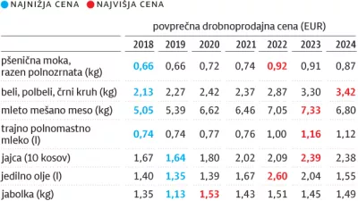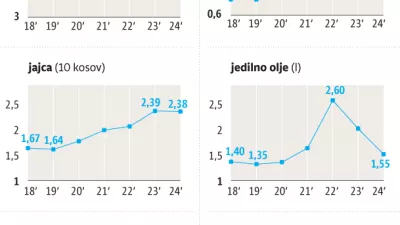 V obdobju po letu 2000 so se hrana in brezalkoholne pijače najbolj podražile leta 2022. Letna stopnja rasti cen v tej skupini je bila takrat 18,6-odstotna. Za primerjavo, lani je bila 2,6-odstotna. Leta 2022, ko so bile podražitve hrane na letni ravni največje, je bil na vrhu sladkor, in sicer se je cena v primerjavi z letom prej zvišala za 59,2 odstotka, jedilno olje se je podražilo za 43,6 odstotka, maslo za 40 odstotkov in sveže posneto mleko za 38,4 odstotka.