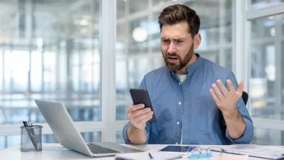Upset man reading online notification message on phone, worker at workplace inside office holding smartphone in hands, got app error, and account blocked. / Foto: Liubomyr Vorona