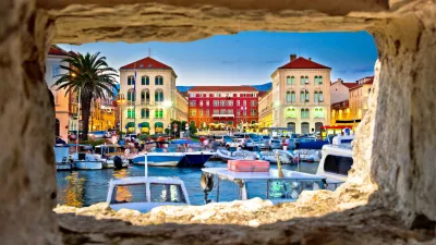 Prokurative square in Split evening view through stone window, Dalmatia, Croatia / Foto: Xbrchx