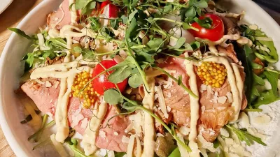 Taljata rečejo ohlajenim rezinam opečene govedine, ki jih kje drugje poimenujejo angleški rostbif, v vsakem primeru pa je bila to sočna hladna predjed, ki ji za volumen dodajo preveč rukole in grahovih poganjkov. Veliko je bilo tudi tatarskega bifteka, začinjenega bolj bogato, kot smo vajeni pri novodobnih mesnih minimalistih, in to nas ni prav nič motilo.