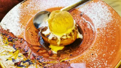 Pečeno jabolko, čokoladna omaka, rozine in vanilijev sladoled, Trattoria Alla Luna