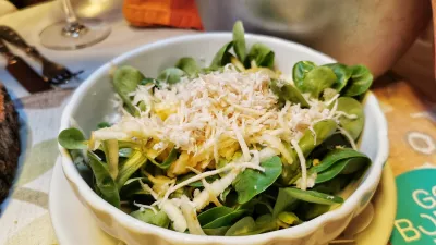 Še ena glavna jed so prašičkova lička, ne tako zdrizasta, kakršna brez vsakega razloga veljajo za specialiteto v Sloveniji, ampak čvrsta kot pravi kosi mesa s praženim krompirjem in polento (15 evrov). Kot pravi Slovenci smo k mesu in prilogi jedli tudi solato, a ta ni bila povsem običajna – motovilec zabelijo z naribanim hrenom in jabolki.