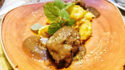Svinjske ličnice v omaki, pražen krompir in polenta, Trattoria Alla Luna