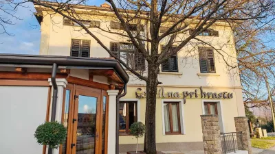 Morda najprej pojasnilo, če boste šli v Gostilno pri hrastu. Ta je sicer tik ob cesti, ampak se je treba za vstop gibati naprej proti notranjosti dvorišča, kjer je postavljen novejši zastekljeni prizidek. Še kar simpatično urejeno in simpatično je bilo tudi v sami gostilni, kjer je v naši jedilnici po italijansko grel prijazen kamin.