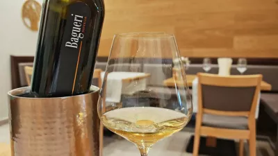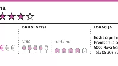 Škoda, da pri penečih vinih niso tako lokalno domači. Na kozarec, recimo, so točili le štajersko-nizozemskega Puklavca, ki za gostilno polni enostavno hišno penino. Jasno, na vinski karti je še marsikaj drugega, vsaj deset penin, tudi lokalnih, in šampanjec Delamotte za povrh. Mi pa smo se nato kot že tolikokrat odločili, da si naročimo steklenico vedno zanesljivega chardonnayja Bagueri za prizanesljivih 26 evrov, ob mesnih jedeh pa še kozarec Ronkovega cabernet franca za štiri evre na kozarec.