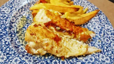 Predlagali so jo pečeno v pečici, kjer se je z njo družil krompir, in rezultat je bil fantastičen, količine ene porcije pa bi zadostovale za dva lačna.