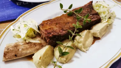 Orjaškega govejega rebra se je medtem držala konkretna količina masleno zmehčanega mesa, ki ga je spremljal pire gomoljne zelene in simpatična koromačeva solata. In tudi goveje rebro dobi pri Ivanu simpatičen, malce dimljen značaj.