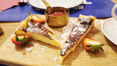 Kaj pa sladice? Ponudili, pravzaprav kar prinesli, so tri zelo posebne jedi. Bogat veganski čokoladni mus je iz Valrhonine čokolade in svilnatega tofuja ter, zanimivo, oljčnega olja. Simpatična sirova torta je iz Pustotnikovega sira, spremlja jo jagodna omaka, najkonkretnejši pa so kranjski štruklji, ki so pravzaprav izvrstne velike palačinke s pehtranom in skuto ter medenim sladoledom.