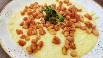 Pokusili smo tudi polento (14 evrov), dve možnosti imajo, zeliščno in takšno z ocvirki, panceto in kozjim sirom. Polenta, ki jo sicer dobijo z eko kmetije Šlibar, se ni izkazala. Ocvirkov niti nismo opazili, panceta pa je bila narezana na prevelike kocke in odločno premalo prepražena, da bi bila okusna.