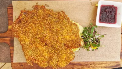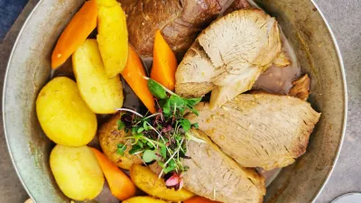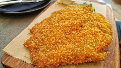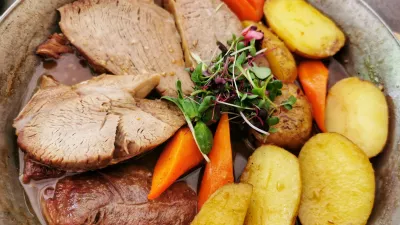 A najhujše je šele sledilo. Z modrim pinotom Krasno, ki smo ga sramežljivo pili celo kosilo, smo poskusili kombinirati dunajski zrezek (24 evrov). Teletina, ki je bila napovedana, je ostala nekje na poti in dobili smo (najverjetneje) kos starejše živali. Meso, vse skupaj postrežejo kar na deski, je bilo temno in trdo, še temnejše so bile drobtine in lahko si predstavljate, da brusnična marmelada ni pomagala. Še slabše je bilo s krompirjevo solato, ki so jo, kdo ve zakaj, položili pod dunajca, kar je solato dobesedno uničilo in iz krompirja je nastala neužitna masa. Ne priporočamo. Bolje se je obnesel slovenski krožnik (24 evrov), ki ga strežejo v vroči ponvi. Zajetna porcija kar štirih kosov okusno pečene teletine v naravni omaki, pečeni krompir in korenje bi zlahka nahranila vsaj dve osebi.