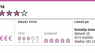 V veliki in, kot se je kasneje izkazalo, razprodani jedilnici, v kateri je bil nekoč hlev, je prostora za kakšnih 30 ljudi in za natanko šest buteljk vina. Pet je hišnih, označenih z etiketo Grondali, iz sosednje vasi Pregara pa je sveža, a polna suha penina Valente (3 evre), s katero smo začeli kosilo.