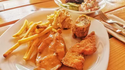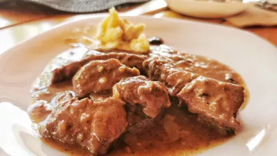 V glavni vlogi je brez dvoma jelen v gosti omaki. Prva zvezda kosila, ki jo velja pokusiti skupaj s krompirjevimi žganci, je ena redkih lokalnih jedi – dödöli. Pokusili smo tudi druge jedi. Recimo prašičkov file, v omaki in ocvrtega. Še malce bolj enostavna jed so kaneloni, ki jih polnijo s sirom in šunko, imajo tudi perutničke, ocvrejo kak kos piščanca pa tudi lignje, konec koncev so otroci pomemben del populacije, ki malica in si seveda ogleduje mini živalski vrt. Kaj vzeti in kako kombinirati s prilogami, je prepuščeno gostu, imajo ocvrti in pečeni krompir, nekaj zelenjave, riž in ob divjačini že omenjene dödöle. Jedi so korektno pripravljene, bi si pa želeli več sezonskosti, sploh v solatnem baru, kjer bi lahko rdeča pesa in francoska solata počakali na zimske čase.
