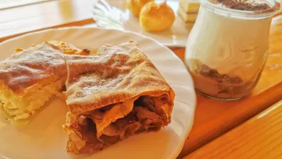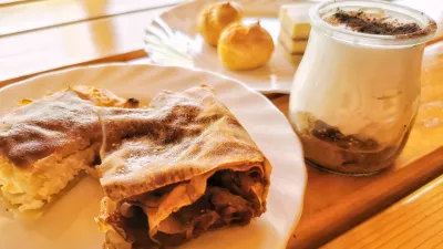 Najbolj sta nam ugajala sirov in jabolčni retaš, le malo manj profiterol, ki je spominjal na princeskine krofe – ali pa je bilo obratno in so princeske spominjale na profiterole. Tisto, kar je bilo sprva videti kot tiramisu, pa se je izkazalo za kremo z bananami. Nasitno in zelo sladko.