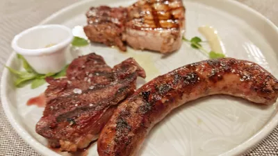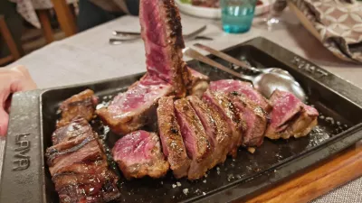 Zmernost cen so nekaj minut kasneje še bolj dokazovale glavne mesne jedi, ki jih pripravljajo v kaminu v jedilnici. Za kakih 700 gramov florentinca, recimo za dve osebi, so računali 35 evrov, je pa res, da je bil kos za okus naše ekipe nekoliko premasten. Za 15 evrov so pripravili tris mesnin; na krožnik postavijo pečeno istrsko klobaso, malce podobno naši pečenici, ombolo in dva kosa ramsteka. K trisu sicer pristavijo kislo zelje in praženi krompir, drugače pa je treba priloge plačati posebej. Pri klasičnem lepo uležanem bifteku (26 evrov) smo tako za špinačo na maslu doplačali pet evrov.
