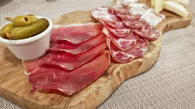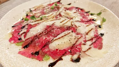 Sobotni kvartet se je lotil dveh simpatičnih sirov, kozjega in kravjega, ki sta se zasidrala ob ekstremnih mesnih dogodkih – sijajni sočni salami, vratovini, panceti in pršutu. Lep, velik narezek, bolj za tri osebe kot za dve (zmernih 20 evrov), ki je zapečatil naše, na mesnine vezano pozno kosilo. Manj je navdušil karpačo iz boškarina, ker so bile rezine mesa na krožniku še vedno zamrznjene in se niso odtalile niti pod odejo zrelega sira ter domačega oljčnega olja.