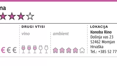 Mimogrede, tudi vino je predvsem domače. Konoba Rino je namreč povezana s pomembno istrsko vinsko kletjo Prelac, kar pomeni, da že na začetku ponudijo svojo solidno, zelo suho klasično penino in potem konkretno alkoholno rdečo zvrst Vita (48 evrov), ki je ostala na mizi do konca kosila. V hladilnikih imajo sicer tudi nekaj vin drugih istrskih oziroma hrvaških kleti, najde pa se tudi kakšna slovenska buteljka.