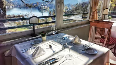V enem najlepših blejskih hotelov za kakšnih 60 evrov postrežejo skorajda izključno sledljivo hrano. Ob nekaj pozdravčkih dobite pet krožnikov, ki po pravilu izvirajo iz predelane slovenske tradicije in pridelkov bližnjih gorenjskih kmetij, lahko pa si sestavite tudi krajši in zato cenejši scenosled. Večerja je daljša in tudi precej dražja, dobrih sto evrov na osebo, takrat pa je na meniju tudi marsikakšna mednarodna jed.