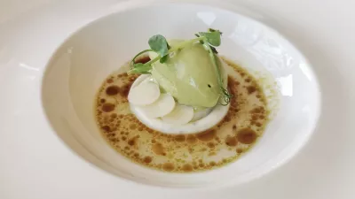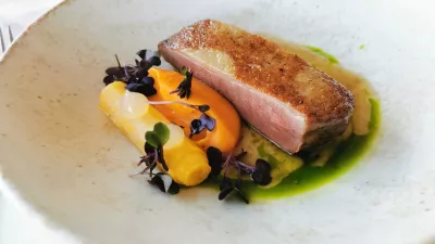 Meumov modri pinot se je srečal s porcijo račjih prsi, ki pa so bile preprosto pretrde, pri čemer ni pomagal niti preveč top nož. Rožnato meso je spremljala lastna omaka, priložili so bučni pire, gomoljno kolerabo in vodno krešo.