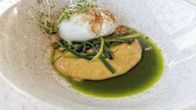 Tudi za prvo toplo jed, ki smo jo podprli s konkretnim Blažičevim tokajem, so poskrbeli pri Vrtu okusov in pri blejski zadrugi. Prispevali so vsak svoje elemente za poširano jajce s porom na koruzni kremi s peteršiljevim oljem in prahom jurčkov. Solidna, zeliščna, predvsem pa avtorska jed na simpatičnih, likovno všečnih krožnikih. Morda je treba še dodati, da so bile prve jedi nemara celo preveč miniaturne, kar se je spremenilo s prvo glavno jedjo.