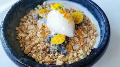 Tudi zadnja, sladka jed pethodnega menija je bila lokalna, gorenjska. Sodelovali so čebelarstvo Kert in lokalna zadruga, na krožniku pa so se družili sladoled iz čebeljega voska, kosi taistega voska, drobljenec bele čokolade, sladkorni »kamen« in cvetni prah. Da bi bilo vse skupaj še bolj sladko, so sladoled in spremstvo polili z mlekom z medom. Ena najbolj sladkih sladic pri nas.