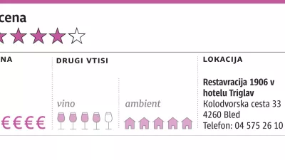 Odveč je razpredati o jedilnici, iz katere se odpira božanski pogled na jezero, na otok s cerkvijo in prelepo Škrabčevo neorenesančno palačo v daljavi. Človeku se ob pogledu skozi okno enostavno odpre apetit, za kar poskrbi tudi suha zlata radgonska penina selection, ki jo točijo za sedem evrov in pol na kozarec. Dodelani mehurčki iz vse boljše kleti Radgonske gorice so sicer vredni vsakega evra, a je treba reči, da so v restavraciji 1906 cene vinske kapljice na kozarec vseeno nekoliko previsoke. Soliden Blažičev Jakot je tako šest evrov in pol, pri glavni mesni jedi je bil Meumov štajerski modri pinot po sedem evrov in pol, čeprav kljub mnogim prijaznim elementom še ni dosegel najboljših.