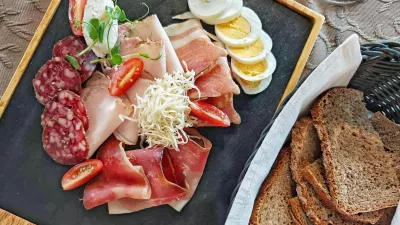 Začeli smo manj ambiciozno, ceneje, bi lahko rekli. Za 11 evrov postrežejo klasičen, ne prevelik narezek za eno osebo, ki smo si ga razdelili pri mizi. Za očitno mesno orientirano kuhinjo se je zdel skoraj preveč generičen, enostaven, ob Gjerkeševi brut natur penini so postregli jajce, šunko s hrenom, tunko, salamo, zaseko in paradižnik ter grahovo zelenje, ki je skozi dvourni obed postalo nepotrebna rdeča nit vseh krožnikov.