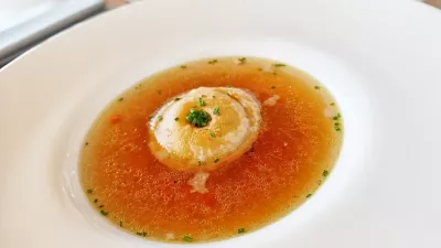 Na mednarodno obarvanem meniju je, kot smo omenili, nekaj lokalnih jedi. Ob gosti, z rezanci, korenjem in koščki govedine bogati goveji juhi ima posebno mesto fazanova juha – s kozicami. Mirno smo jo napadli, čeprav se je zdela prikuha, ocvrtek iz kozic, skoraj preveč neobičajna za te kraje. Pa se je dobro izteklo. Goveja juha je bila solidna, fazanova, ki jo pri mizi natočijo na ocvrtek in jušno zelenjavo, pa celo izjemna.