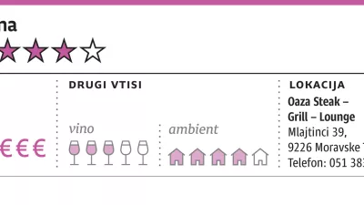 Juhi sta bili razmeroma poceni, po štiri oziroma pet evrov, mi pa smo počasi že razmišljali o vinih za nadaljevanje. Gjerkešev dišeči in bogati chardonnay Woodstock (osem evrov na kozarec) je brez dvoma eden od favoritov za najboljše belo vino z Goričkega, pri rdečih pa, nerazumljivo, na kozarec ne odpirajo najvišjih linij Marofove kapljice – zadovoljili smo se z zvrstjo Goričko noir za pet evrov. Zvrst je šla k ocvrtima kockama natrgane govedine, najcenejši topli predjedi (10 evrov), pri kateri si pomagajo z gosto omako bordelaise. Že kar nasitna jed, podobno kot jurčki na žaru na ajdovi polenti. Spet so motili grahovi poganjki, ki očitno postajajo povsod po Sloveniji nadomestek za rukolo in so gotovo podobno zelo zdravi. Ko smo se jih znebili, so imele jedi pri Oazi svoj smisel in predvsem okus.
