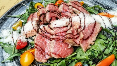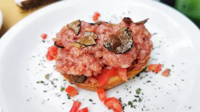 Ob tem nam ni dalo miru nekaj, kar smo slišali med naštevanjem predjedi – olive all'ascolana, specialiteta iz mesta Ascoli v Markah v osrednji Italiji, kjer olive napolnijo z mesom in ocvrejo. Prigrizek, ki bi ga jedli tudi ob televiziji, smo si tokrat privoščili ob glavni jedi. Na Trubarjevi v tej kategoriji ponujajo le dve jedi, tunino in govejo taljato, mi smo tisti večer jedli meso. Lepo pečeno mehko govedino položijo čez rukolo in češnjeve paradižnike treh barv, potresejo s parmezanom in pokapljajo z balzamičnim kisom. Okusna jed, predvsem pa spet ugodna cena – marsikje po Sloveniji bi šla prek 30 evrov, v atriju na Trubarjevi stane 19 evrov.