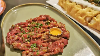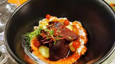 Valentinova vinska spremljava (24 evrov) ni predvidevala, da bi zaljubljenci pili šampanjec, naše omizje pa se je vseeno odločilo za Veuve Clicquot za dobrih 11 evrov na kozarec. In potem smo čakali in čakali in čakali in čakali, da so na bonsaj mizico prinesli prvo hrano. Za dve osebi so začeli z omenjeno kot kamen trdo fokačo s stracciatello, sušenim paradižnikom, olivami, kaprami in rožmarinom. Zraven je šla žepna porcija ne ravno čvrstega tatarskega bifteka s prepeličjim jajčkom in spenjenim maslom. Na svojem mestu je bila še verjetno najboljša jed večera, rdeča pesa s kozjo skuto, ribezom in vasabijem. In to je bilo vse – za dve osebi! Je pa seveda res, da več hrane, še posebej ob steklenici Gradis'ciuttovega chardonnayja (45 evrov), ki smo si jo naročili, ne bi šlo na mizo. Že tako smo pazili, da nam kaj ne pade z nje.