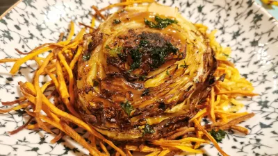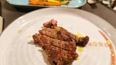 Potem je minilo še nekaj časa, kakšnih 40 minut, pa smo dobili tudi glavno jed. Načrtovali so, da zaljubljeni par skupaj pomalica 300-gramski škotski steak, niso pa pomislili na to, da je lahko polovica para vegetarijanskega. Po temeljitem premisleku so ugotovili, da bodo prinesli pol steaka, druga polovica pa bo pečeno polovico zeljne glave s krompirjevim drobljencem. Človek bi pomislil, da se hecajo, po že tako miniaturnih predjedeh jim je uspelo pomanjšati še glavne jedi. Mimogrede, zelje je bilo okusno, priloga (pečen korenček) ni bila slaba, mesnina pa je bila tako majhna, da je niti ne gre komentirati. Še najboljši del glavne jedi je bil piten Hergov jeruzalemski modri pinot (šest evrov na kozarec).