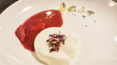 Očitne poporodne težave smo reševali s sladicami. Neuspešno. Vsak par je dobil eno porcijo generične panakote z jagodno omako, za konec so dodali še dva čokoladna bombona, enega s karamelo in drugega z limeto. Prisrčno, za zaljubljence.