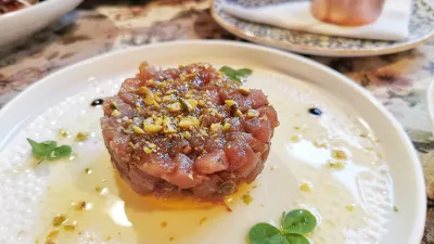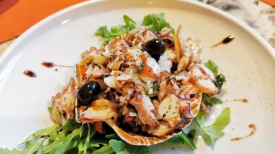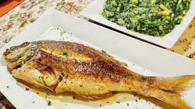 Začetek z morskimi predjedmi je kot tornado odpihnil vse dvome. Sladki bakalar in pašteta iz sardin, ki sta se rimala z mehkim kruhom, tartar tune s pistacijo in hobotnica v solati, blaga, kot se le da, brez pretiravanja s kisom. Vsem jedem se seveda poda hišno dalmatinsko oljčno olje, ki ga točijo kar iz velikega soda.