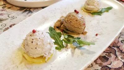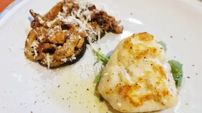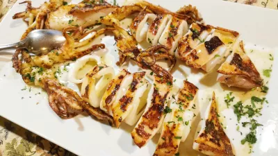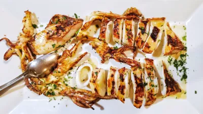 Če je bil tataki kot kakšen fin biftek, zunaj pečen, notri rožnat in topeč se v ustih, so bili najboljši svoje vrste tudi jadranski lignji. Če vas ne prepričajo s svojim gigantskim obsegom, naj povemo, da so bili hkrati sijajno zapečeni in ne trdi, kot se včasih pripeti, ampak mehki, tudi brez velikih avtorskih posegov, če ne štejemo Sanctumovega chardonnayja, ki se nam je pridružil in se srečal še z lički grdobine v spremstvu praženih lisičk, melancanov in čebule. Mala, žepna specialiteta, ki jo velja pokusiti vsakič, ko v kuhinjo pridejo take surovine.