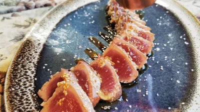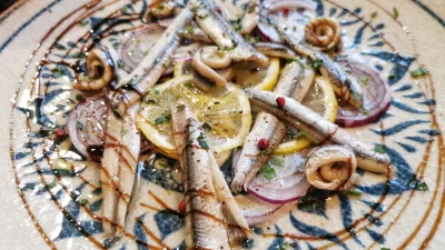 Velikemu dela omizja so najbolj ugajali nenavadno učinkoviti, sladko-kisli inčuni z malo rdeče čebule in limone, ki so napovedali konkretnejše jedi. Še preden smo se spet potopili v jadranske globine, smo izvedeli, kateri so trenutno najboljši v deželi cvička, in ugotovili, da imajo letos polno klet Cvelbarjevega cvička. Po krajši degustaciji smo se strinjali, da sploh ni slab in – to se bo sicer slišalo poceni – povsem znosno se je spoprijel s tatakijem tune, največjim in najboljšim, najčistejšim in najenostavnejšim, ki smo jih pokusili v zadnjem času.