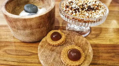 Sladice se zgodijo v treh delih, ob dišečem Steyerjevem tramincu se v predsladici predstavi sladoled iz misa bučnih semen, sledi pa storž iz pšeničnega zdroba z lešnikovo karamelo in beljakovo peno s smrekovimi vršički. Za Fickovim zeliščnim likerjem in džintonikom s hišnim džinom pa se zgodijo še bomboni iz črne čokolade v ajdovi pokovki, lincerji z želejem iz kavne kombuče in »kamni«, polnjeni z jurko.