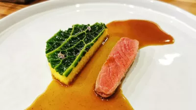 Raca je na mizo prispela v dveh etapah. Najprej kot »kost z mozgom« oziroma izdolben pastinak, polnjen z račjo majonezo in oblit z račjim fondom. Sledile so rahlo dimljene račje prsi, prej marinirane v jabolčnem kisu. Da jed ne bi bila prelahka, priložijo pire iz sladkega krompirja s kavo, dimljeno omako iz račjih kosti, rdečo peso in sijajno domačo marmelado iz češenj in malin.