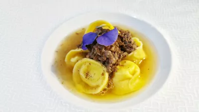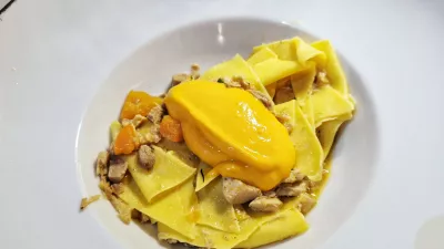 Pot v naslednjo fazo smo tlakovali s hišnim sauvignonom in se držali pravila, da v Italiji vedno, če je le mogoče, naročimo testenine. Na krožniku so bili maltagliati, krpice nepravilnih oblik, z ragujem faraonke in kremo pečene paprike, sestrične nam bolj znanega ajvarja. Izjemno.