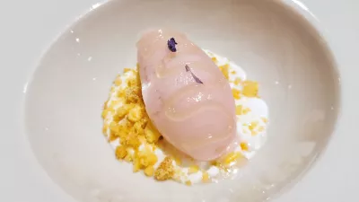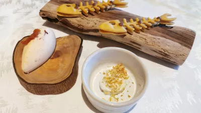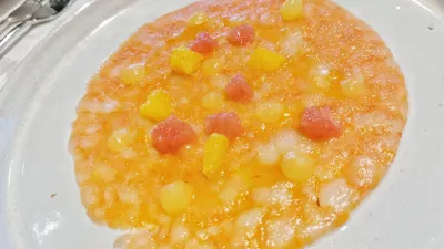 Malce bolj je ugajala bogata, gosta in konec koncev kar nasitna krompirjeva juha ali velutata, kot ji pravijo. Nalijejo jo na kefirjevo peno in ji dodajo profiterol, polnjen s čemažem. Toda v času, ko narava ponuja toliko sveže zelenjave, je nerazumljivo, da se je kuhinja odločila za krompirjevo juho. Res pa je, da se je pri vseh jedeh zdelo, kot da so jih zasnovali karseda »brezčasno«, da jim jih ni treba spreminjati glede na letni čas. No, ja.