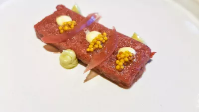Kruh naj bi torej ostal še za spremljavo manjšemu in hudo generičnemu govejemu tatarcu z drobnjakovo majonezo, zeliščnim maslom in vloženo rdečo čebulo. V istem, torej prvem hodu je na drugi strani prispel karpačo iz rdečih gamberov z agrumi, solnim cvetom in oljčnim oljem, a nam tudi tega kljub vsem dodatkom ni uspelo razglasiti za veliko jed.