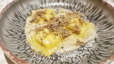 Sledili so ravno prav čvrsti krompirjevi njoki z neizrazito kombinacijo bučkine kreme, albuminske skute in prahu iz bučnega olja, ravioli, polnjeni z burrato, pa so nastopali v kremi iz izrazito močnega ovčjega sira, ki je preglasil celo tartufe.