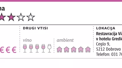Če že nismo šli v klet, naj vsaj omenimo, kakšna je bila vinska karta. Obsežna, ni dvoma, največ je, razumljivo, vin sosednjih kleti, Marjan Simčič, Edi Simčič, Movia in Dolfo, čigar vina v praktično vseh fazah ponudijo na kozarec. Na karti je še nekaj drugih Bricev, nekaj zamejcev in Italije, manj Francozov in Združenih držav. Nekaj je tudi vin, ki gredo v tisoče evrov, manjka pa, kdo ve zakaj, bližnja Klet Brda. Ob vsem tem velja omeniti, da so mnoge steklenice na vinski karti precej oddaljenih letnikov in spraševali smo se, ali niso nemara ostale iz časov prejšnjih lastnikov, novih pa niso nabavljali.