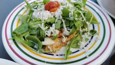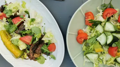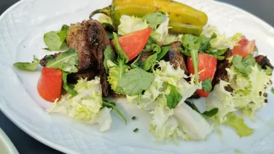 Ko so prišle na vrsto glavne jedi, je bila na izbiro goveja taljata (18 evrov), cezarjeve solate pa je medtem, ko smo jo naročili, zmanjkalo. Izginila je. In tudi taljata se je zdela malce premajhna, kot bi porcijo razdelili za dva. Koščke lepo mehke in solidno obdelane govedine so opremili, uganili ste, z rukolo, zeleno solato, nekaj paradižnika in paprike, ki bi lahko bila bolj pečena. V vsakem primeru lahko zagotovimo, da se ravno najedli nismo.