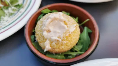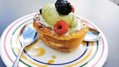 Morda nam je zato prav prišla sladica. Ponudili so goriziano, nekakšen kipnik iz sadnega kruha, ki ga postrežejo s pistacijevim sladoledom in jagodičevjem. Prijazna kombinacija, ki pa na žalost ni popravila vseh težav našega kosila na meji dveh dežel.