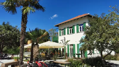 Super osmica je večnamenski prostor, ki povezuje kulturo, umetnost in lokalno gastronomijo. Novogoriška mestna občina je obnovila obstoječi objekt in ga namenila novim vsebinam. To lahko preberemo na uradnih spletnih straneh o projektu obnovljene hiške, ki je stal, reci in piši, milijon in 800 tisoč evrov. Hiška z lokalom stoji ob železniški postaji na Trgu Evrope oziroma Piazza della Transalpina, kjer se prosto hodi čez mejo – hecno, le 100 metrov stran so na mejnem prehodu italijanske policijske kontrole. Kontrole, ki kažejo na norost modernih politikov, ki mislijo, da neumni begunci na zahod hodijo čez kontrolo, ne pa čez trg, tam, kjer jih nihče ne bi ustavil.
